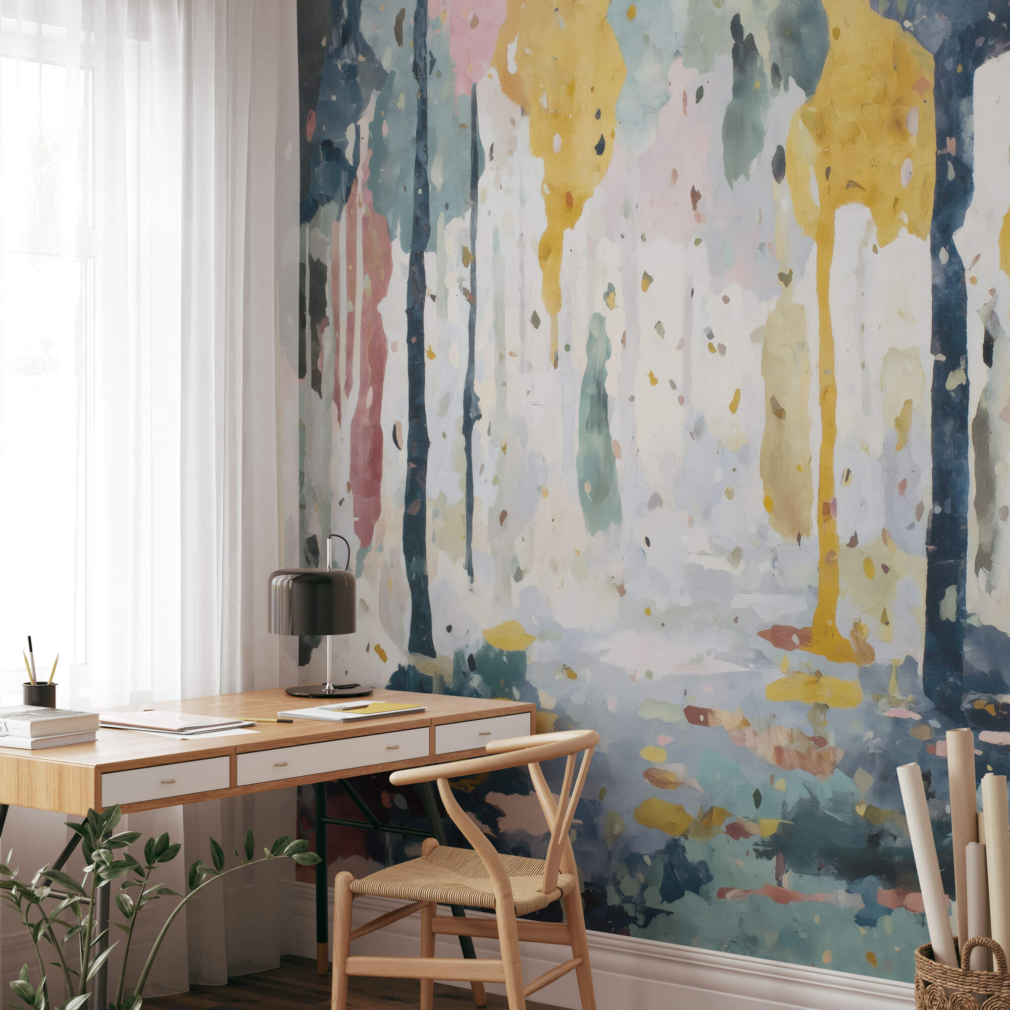 Gold, Dunkelblau und Rosé fließen ineinander wie Licht, das durch einen geheimnisvollen Wald fällt.