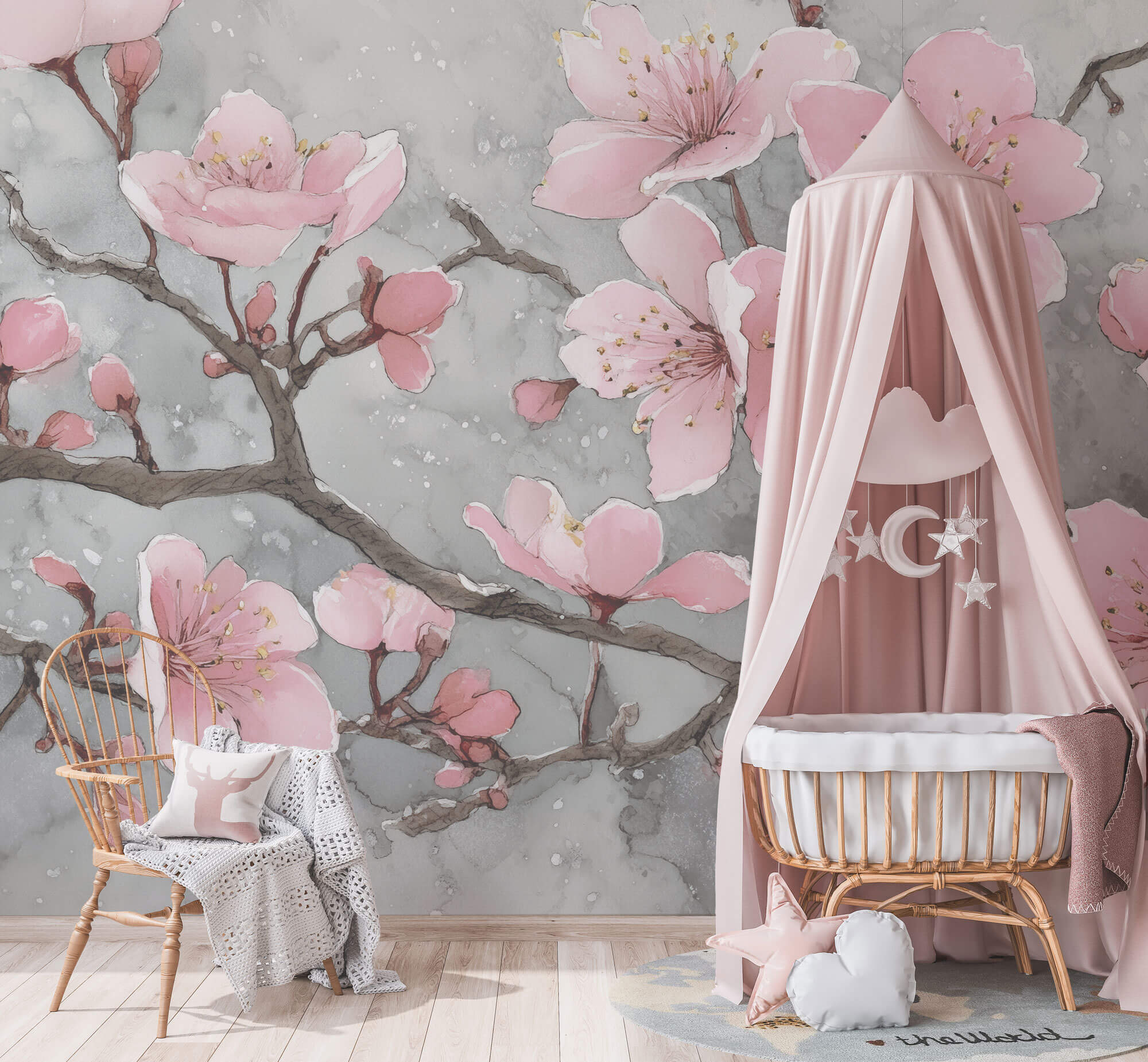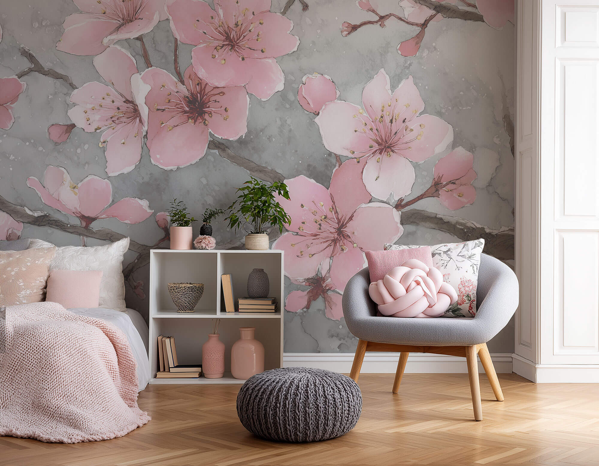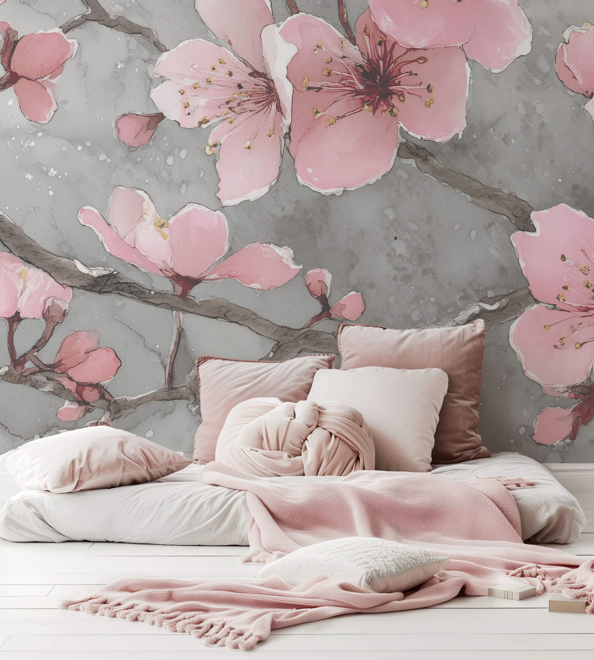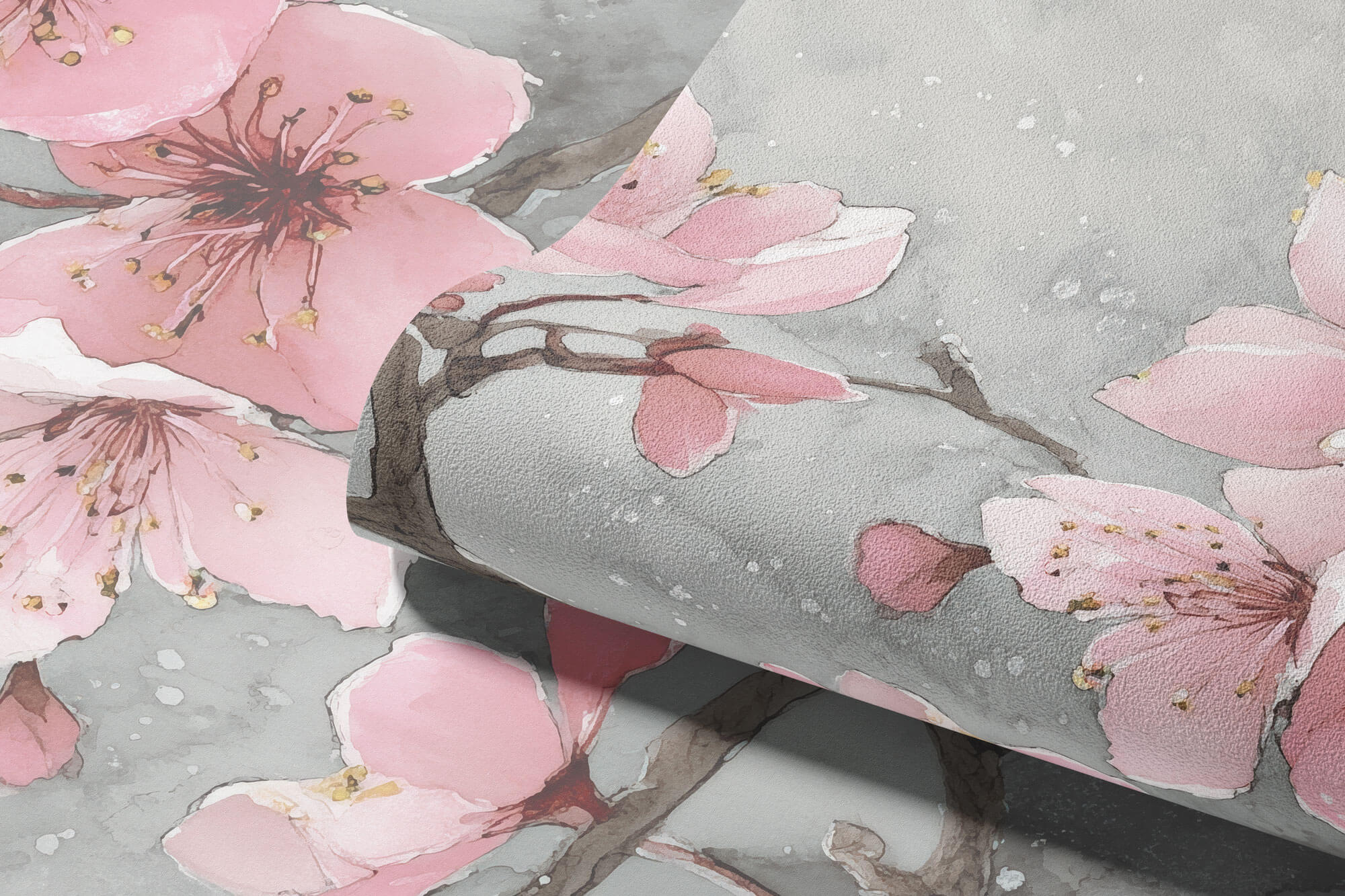 Blush ist eine florale Tapete mit Kirschblüten in Aquarelloptik vor einem steinähnlichen, grauen Hintergrund. Die zarten rosafarbenen Blüten setzen einen sanften Akzent und bringen Ruhe und Natürlichkeit in den Raum.