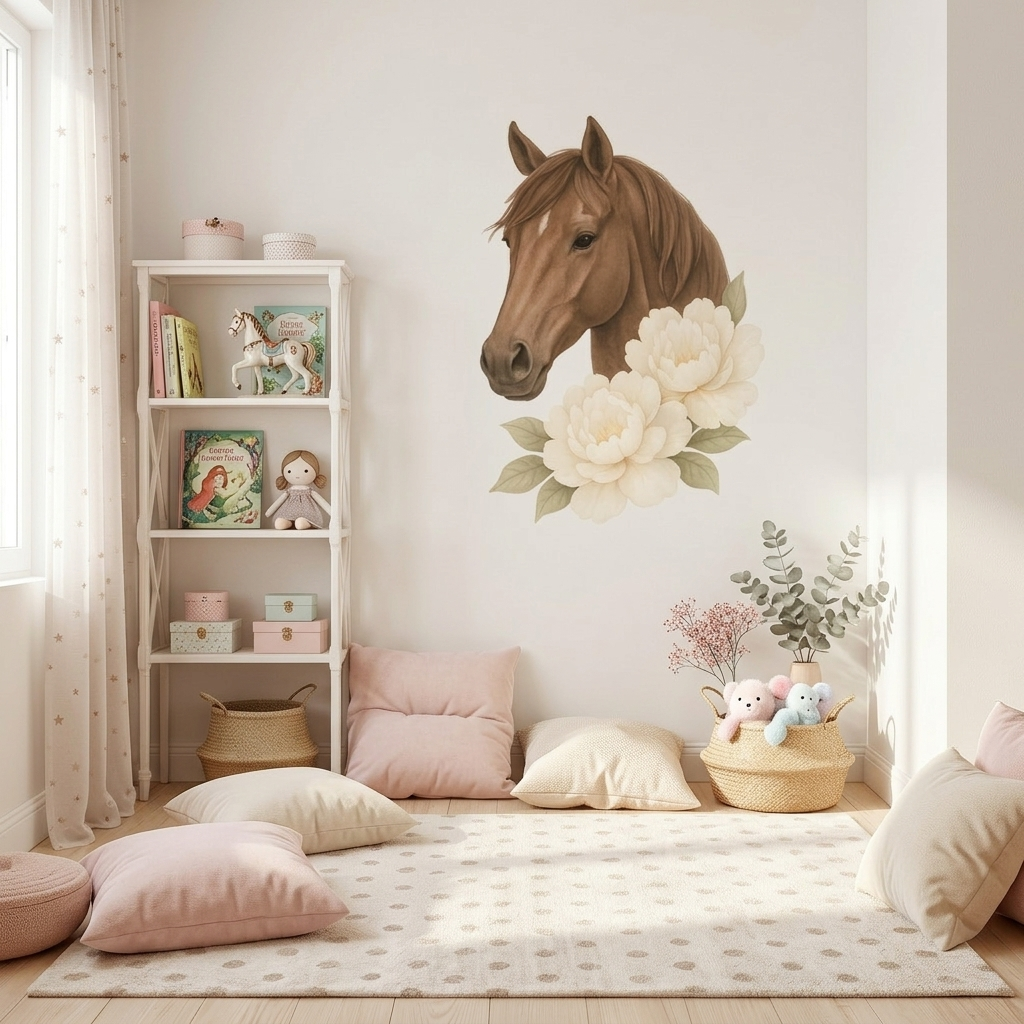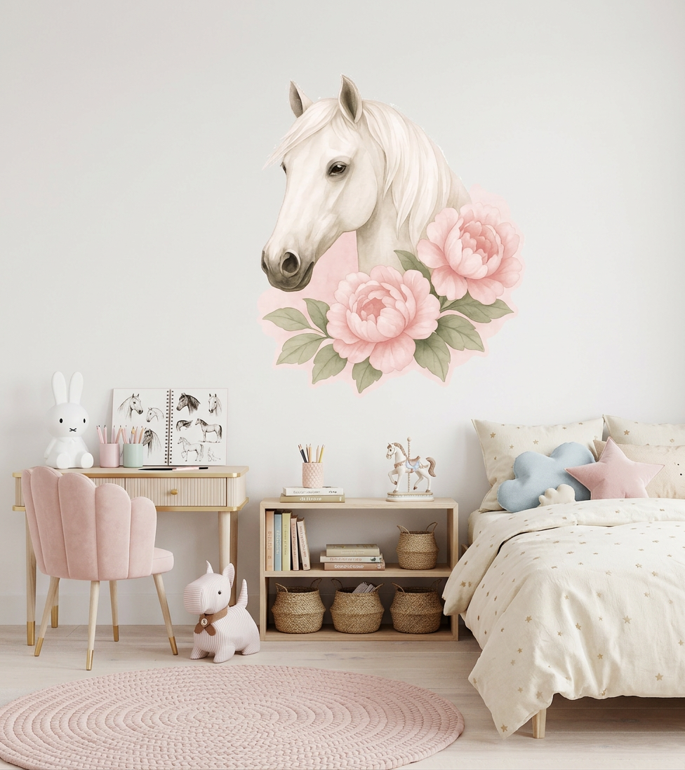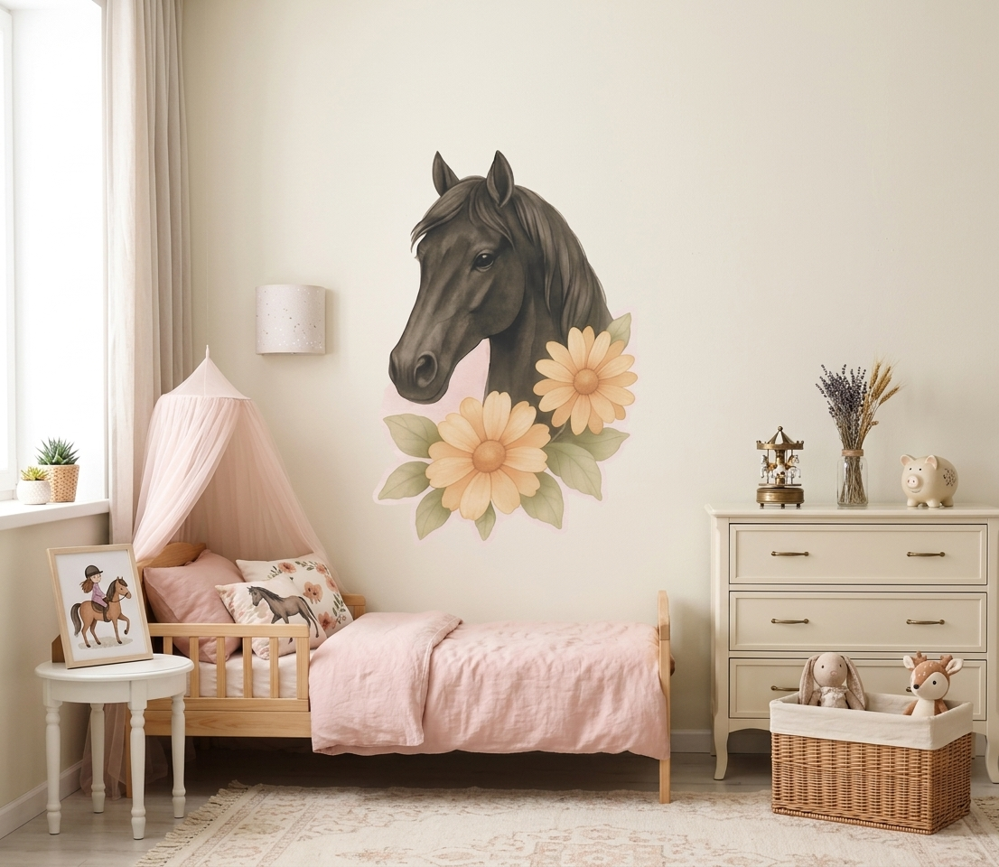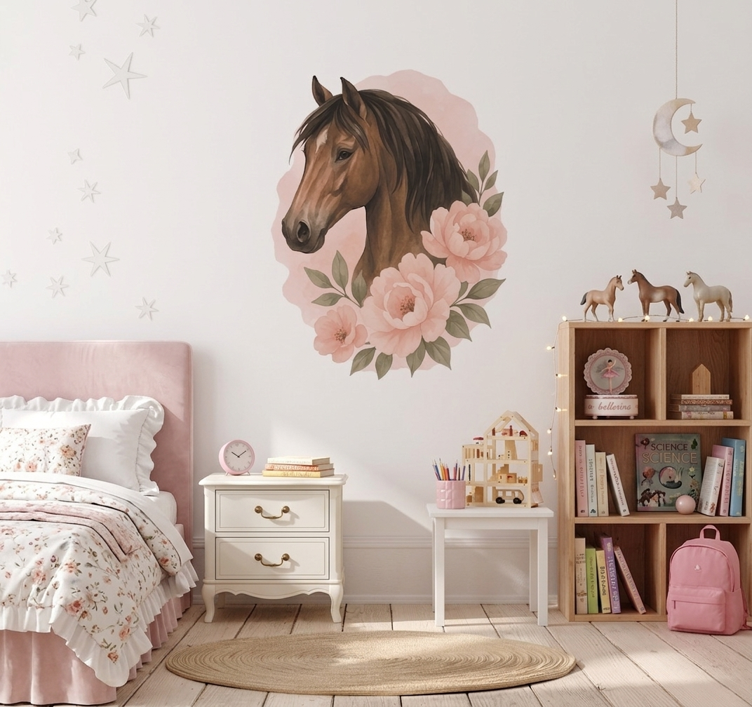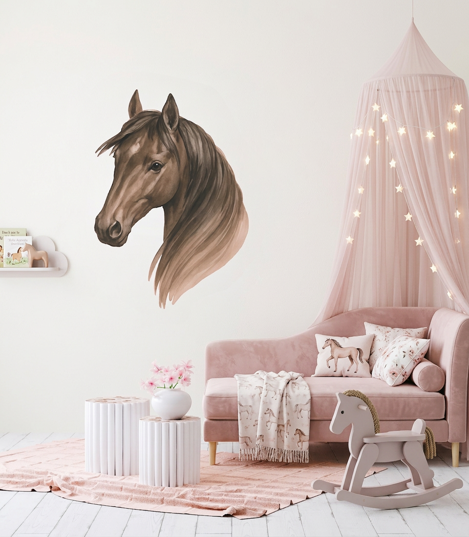 Entdecke wunderschöne Wandsticker mit realistischen Aquarellporträts von Pferden – perfekt für kleine Pferdeliebhaberinnen und Hobby Horse Fans!