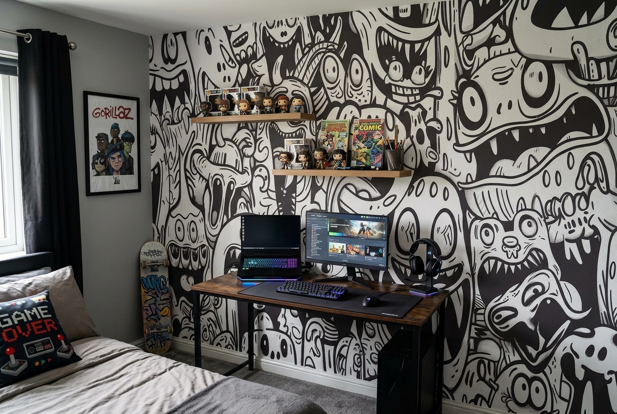 This black and white wallpaper takes us to a world full of monstrous creatures that hide in the dark recesses of the imagination, this wallpaper provides a dose of excitement that will stimulate creativity. Perfect for boys with a vivid imagination and a love of adventure.