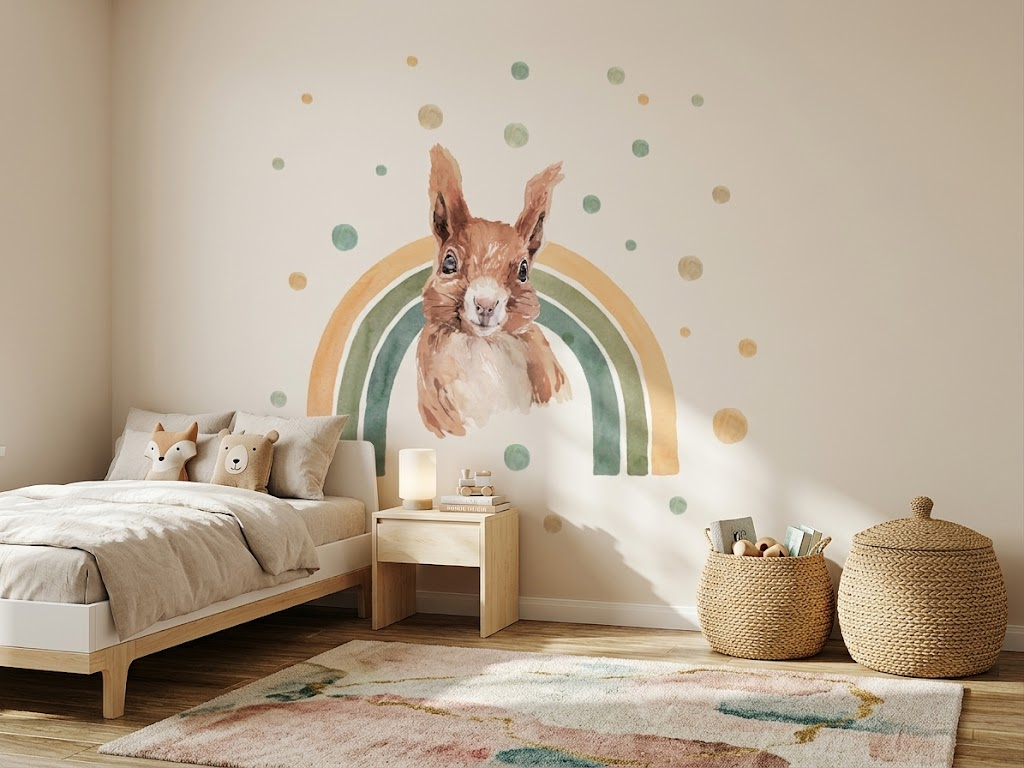 Urocza wiewiórka pod tęczą wprowadza do wnętrza ciepło, lekkość i dziecięcą radość.