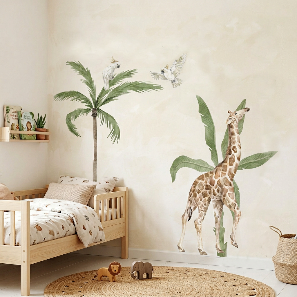 Naklejka OASIS – żyrafa to zestaw dużych akwarelowych elementów w stylistyce safari: żyrafa naturalnej wielkości w proporcjach dziecięcych dekoracji, tropikalne palmy, ptaki oraz liście bananowca. Delikatne beże i zielenie dobrze komponują się z drewnianymi meblami oraz pokojami urządzonymi w stylu jungle. Możliwość dowolnego rozmieszczenia poszczególnych elementów pozwala dopasować dekorację do układu ściany.