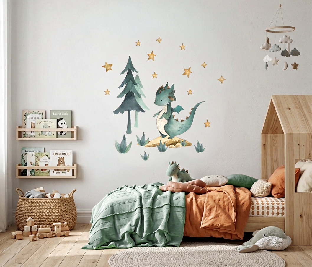 Miętowy smok to delikatna i przyjazna dekoracja, która świetnie sprawdzi się w pokoju dziecka. Dzięki stonowanej palecie zieleni i szarości zestaw łatwo dopasować zarówno do jasnych wnętrz skandynawskich, jak i do pokoi w kolorach beżowych, miętowych czy naturalnego drewna.