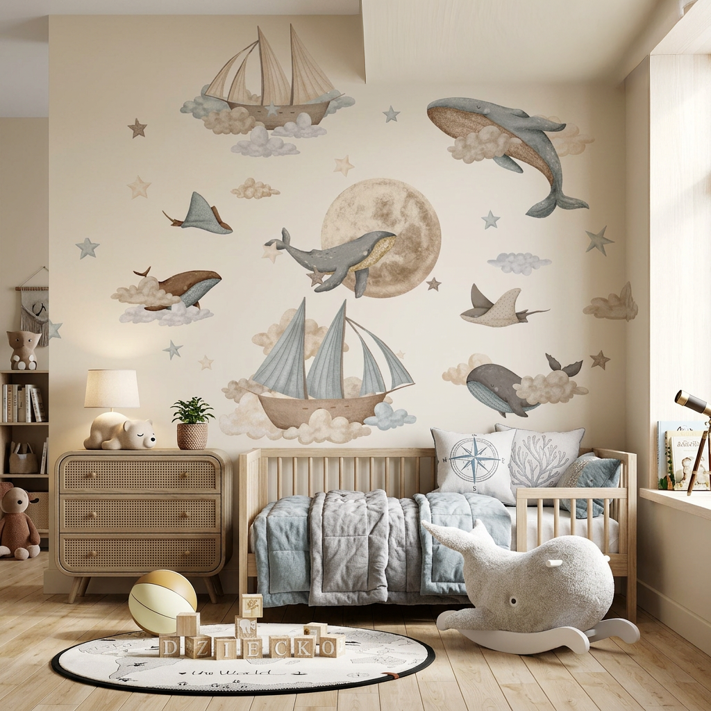 Naklejka ścienna STARDUST przedstawia zestaw dekoracyjnych ilustracji — statki, wieloryby, gwiazdy i miękkie chmurki — w spokojnej, neutralnej palecie: beże, kremy, szarości i chłodny błękit. Styl ilustracji jest łagodny i akwarelowy, co pozwala subtelnie wkomponować dekorację zarówno w pokój chłopca, jak i dziewczynki.