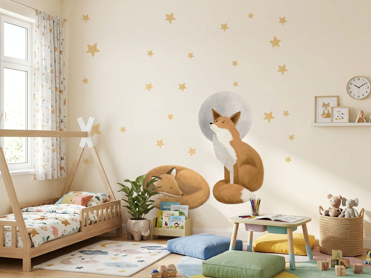 W zestawie znajduje się siedzący lis na tle księżyca, śpiący lisek oraz komplet gwiazdek — wszystkie elementy w delikatnym, akwarelowym stylu. Zestaw pozwala stworzyć lekką, uporządkowaną kompozycję na ścianie, dopasowaną do nowoczesnego pokoju dziecka