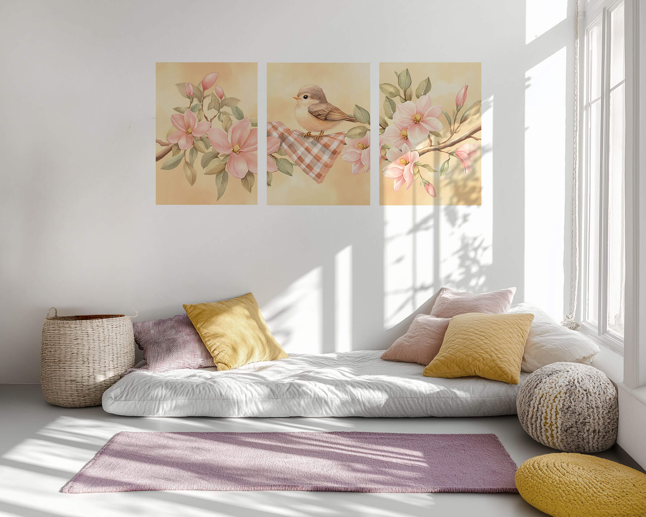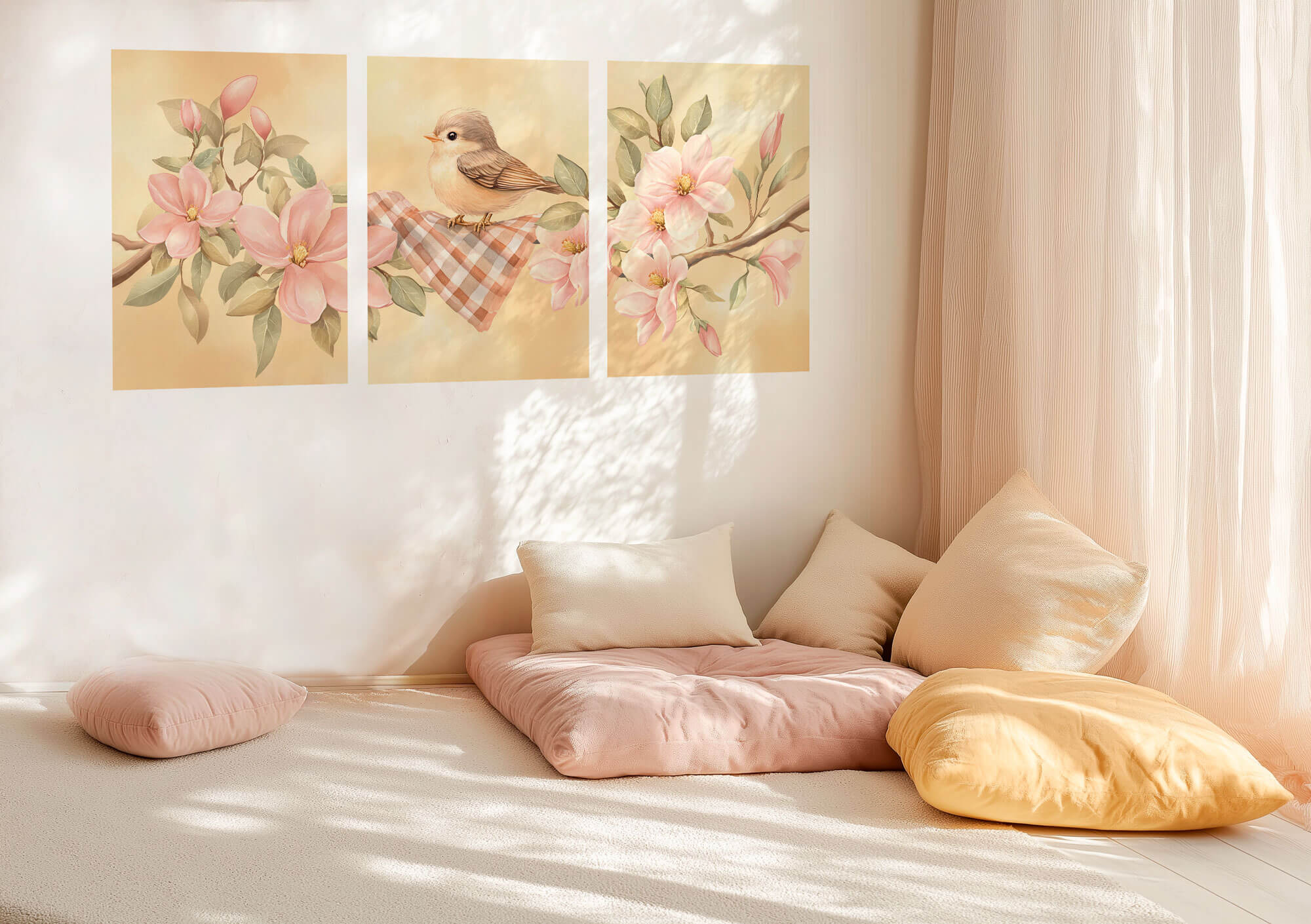 Uroczy komplet trzech plakatów z serii LULU, przedstawiający delikatne magnolie i małego ptaszka siedzącego na gałązce. Subtelne odcienie beżu i różu wprowadzają do wnętrza spokój, ciepło i przytulny nastrój. Idealne do pokoju dziecka, sypialni lub wnętrz w stylu boho.