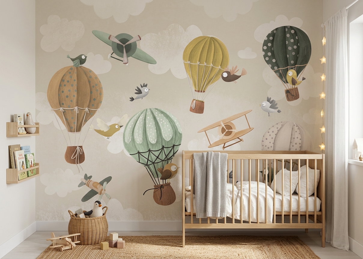 Tapeta Balloo Balloo przedstawia spokojną, ilustracyjną scenę z balonami, samolotami i ptakami unoszącymi się wśród jasnych chmur.
