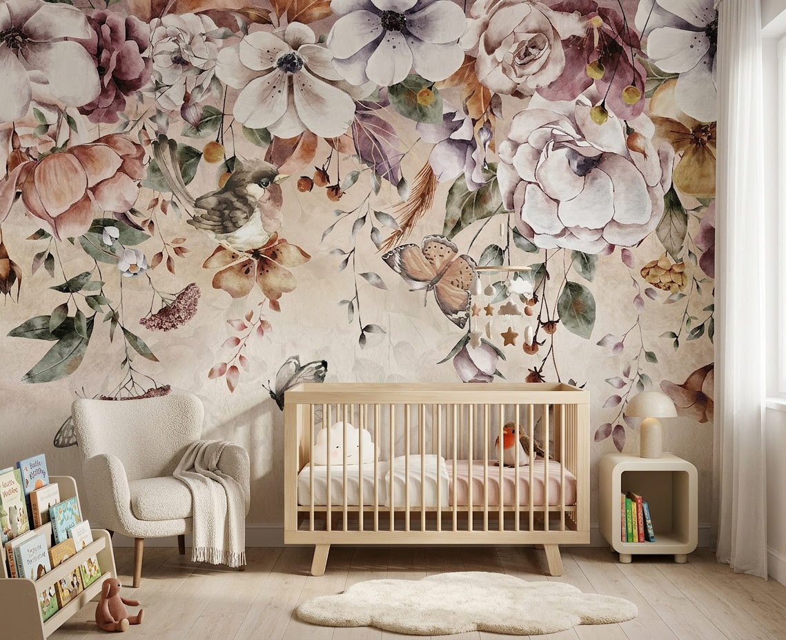 Tapeta BLOOMI to subtelna kompozycja inspirowana ogrodem – z przewieszającymi się kwiatami, motylami i spokojnym ptaszkiem pośród pastelowych barw.