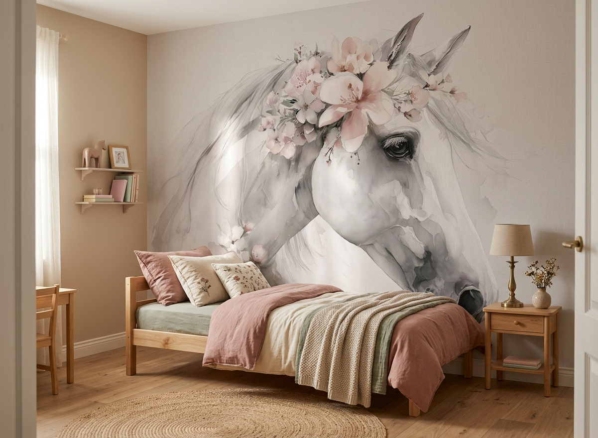 Belle to subtelna tapeta przedstawiająca białą klacz w kwiatowym wianku – połączenie siły, delikatności i naturalnego piękna.