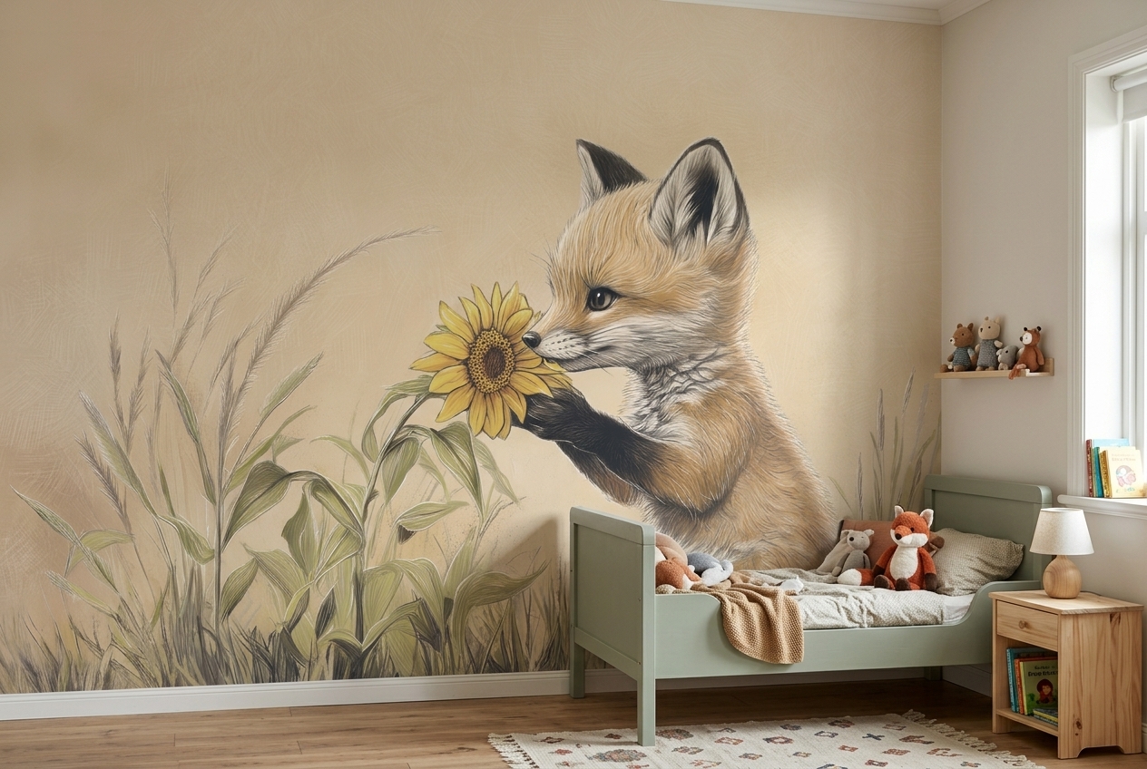 Przedstawiamy tapetę z uroczym liskiem, który wącha słonecznik pośród letnich traw. Ta pastelowa ilustracja została narysowana w stylu kredki i akwareli, co nadaje jej wyjątkowej delikatności i bajkowego klimatu.