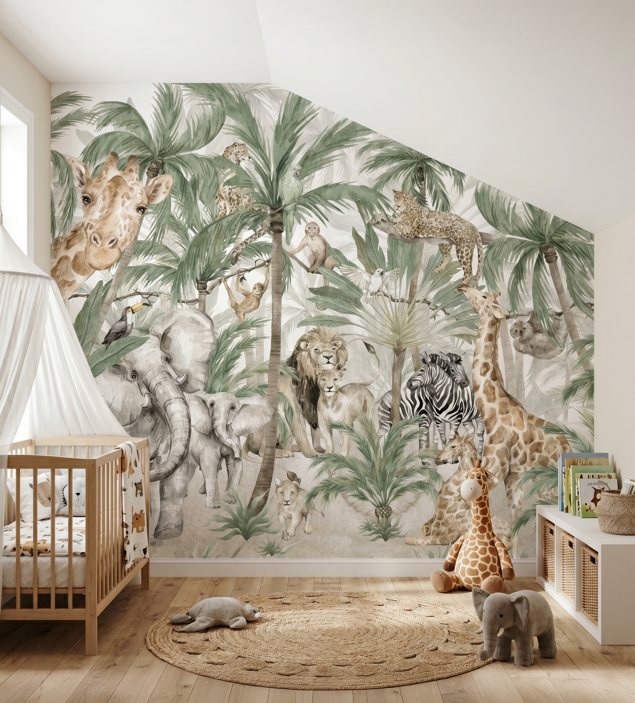 Przenieś swoje dziecko w podróż do dżungli z tapetą "OASIS". Egzotyczne zwierzęta, kolorowe papugi i tajemnicze jaguary stworzą niezwykłą atmosferę w pokoju Twojego małego odkrywcy.