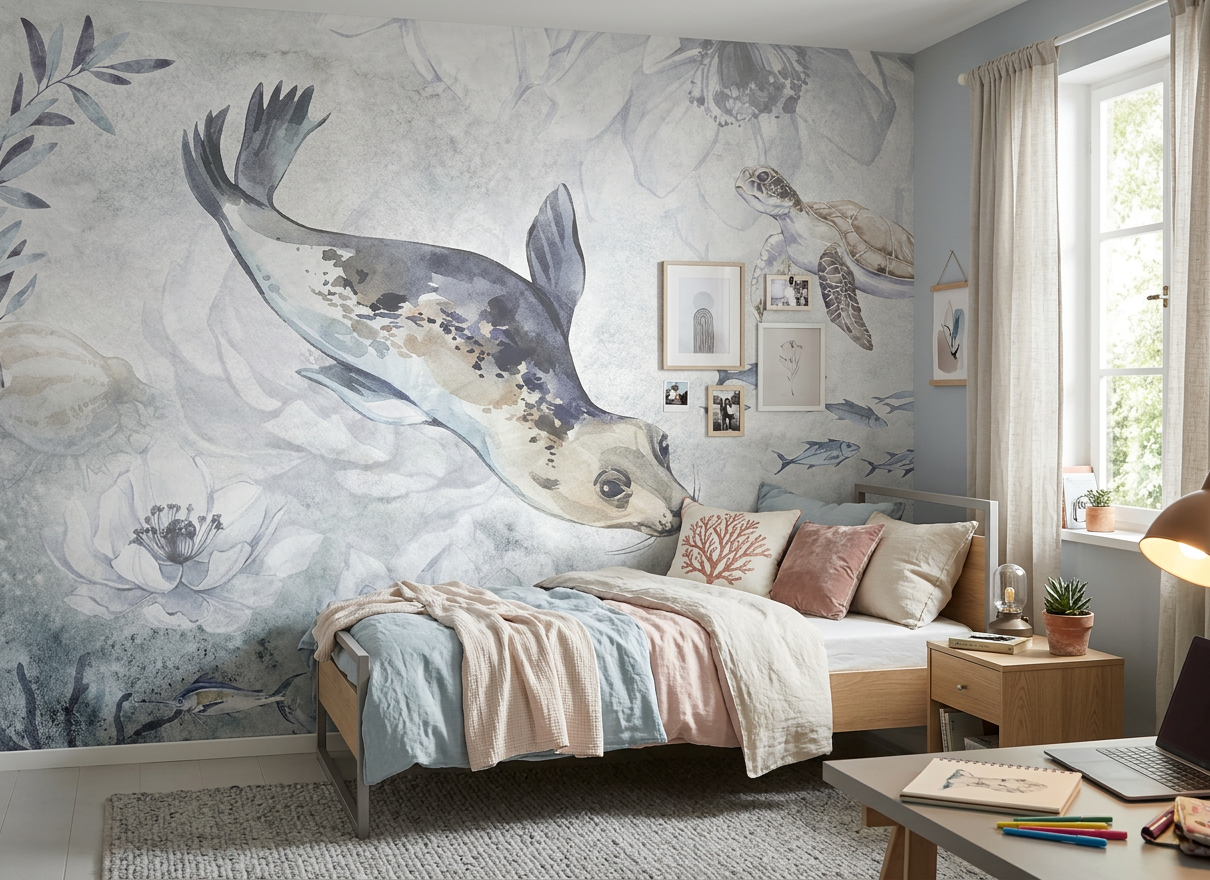 Ożyw swoje wnętrze tapetą dla dzieci z uroczymi fokami unoszącymi się w oceanicznych falach. Stwórz spokojny pejzaż pełen delikatności i uroku, który przeniesie Cię w magiczny świat pod wodą.