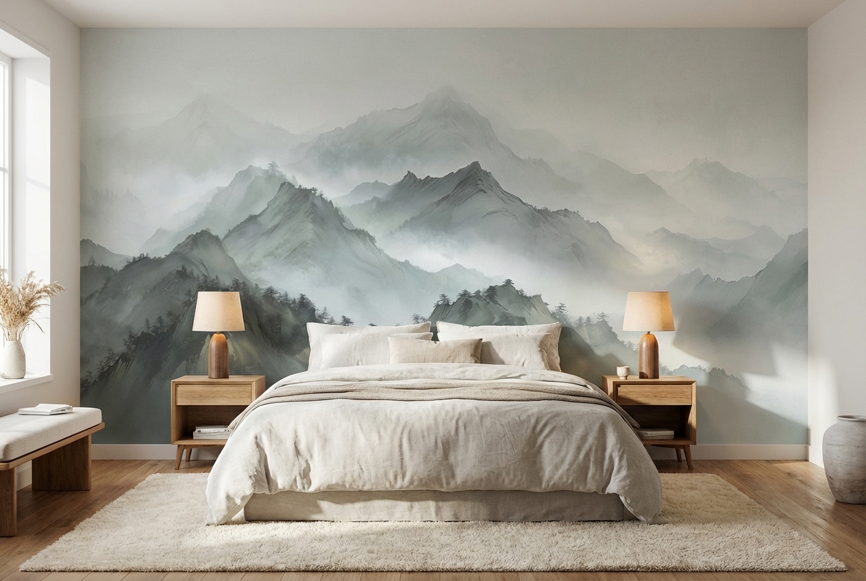 Mistyczna panorama gór otulonych mgłą — „Stillness” to mural ścienny w stylu inspirowanym klasycznym malarstwem tuszem. Odcienie szarości, czerni i chłodnej zieleni tworzą spokojny, niemal medytacyjny krajobraz, który wprowadza do wnętrza atmosferę ciszy i głębi. Tapeta doskonale komponuje się z naturalnymi materiałami i stonowaną kolorystyką – idealna do sypialni, salonu czy gabinetu.