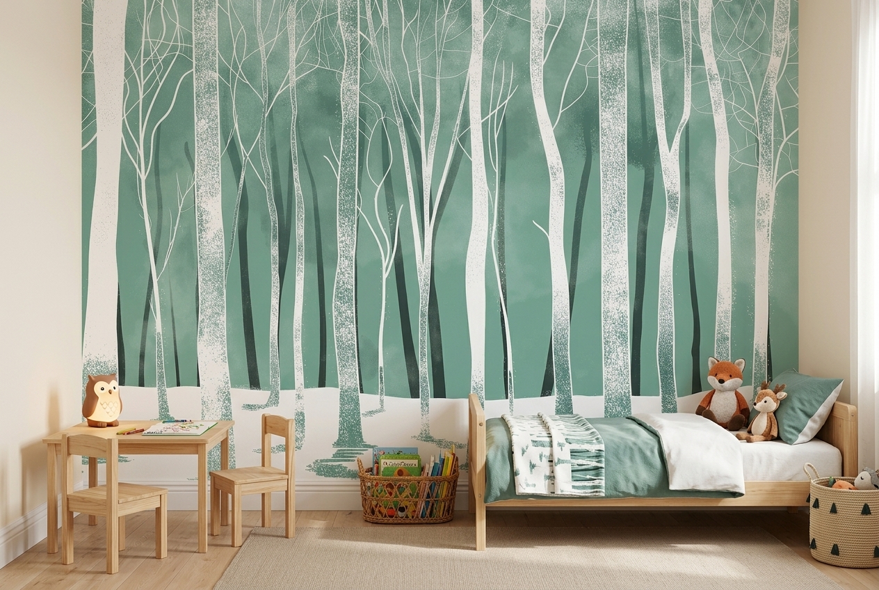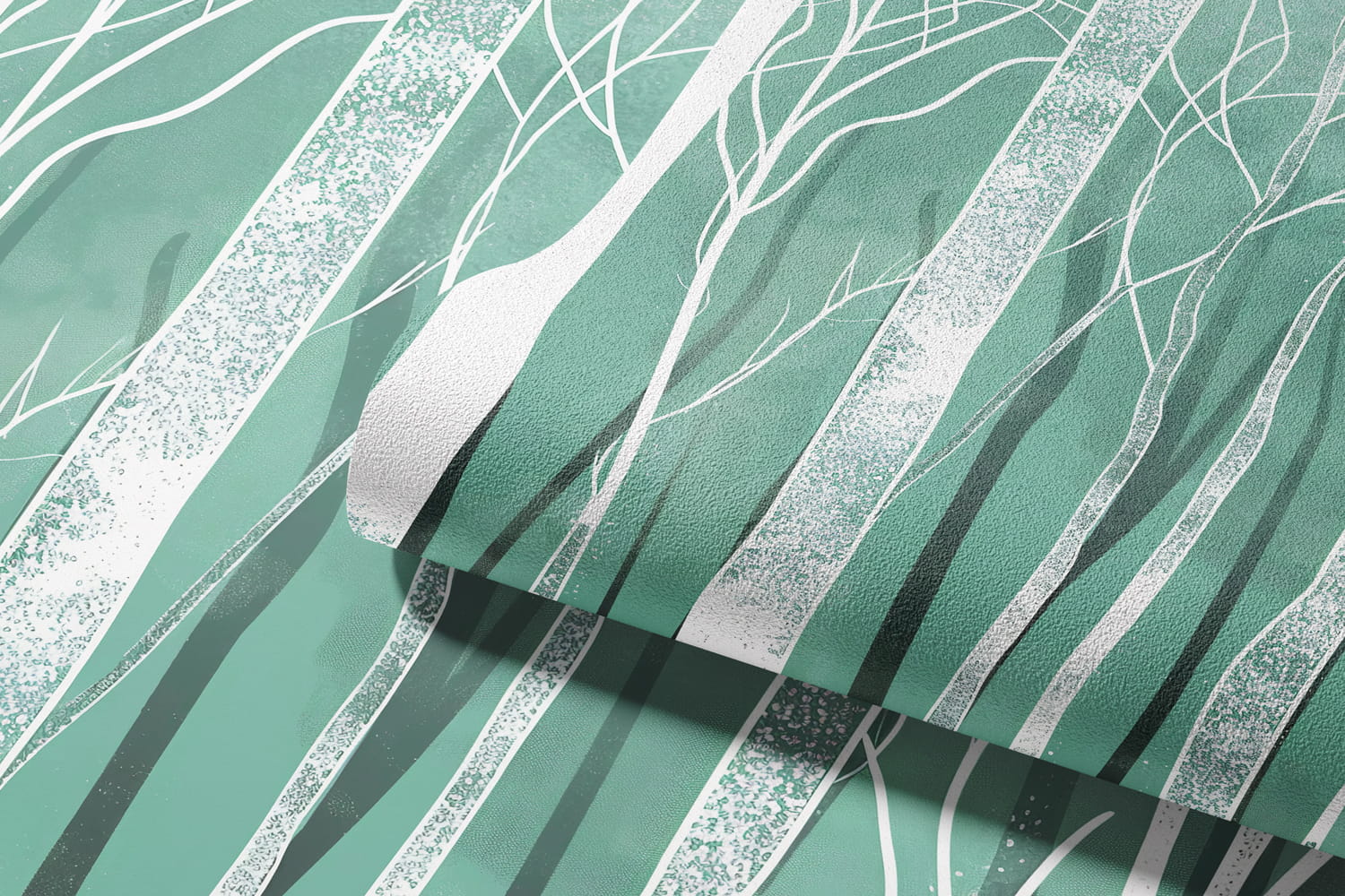 Wzór ten łączy rysunek tuszem z subtelnymi, stonowanymi barwami, prezentuje piękno zielonego lasu z brzozami. Utrzymana w minimalistycznym stylu, tapeta emanuje spokojem i harmonią, zapraszając do chwili wyciszenia.