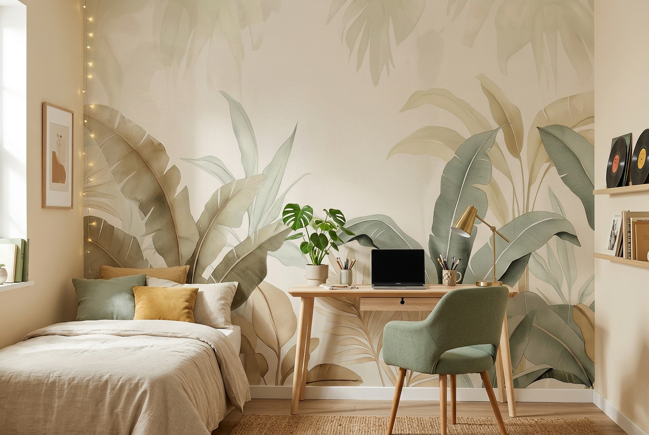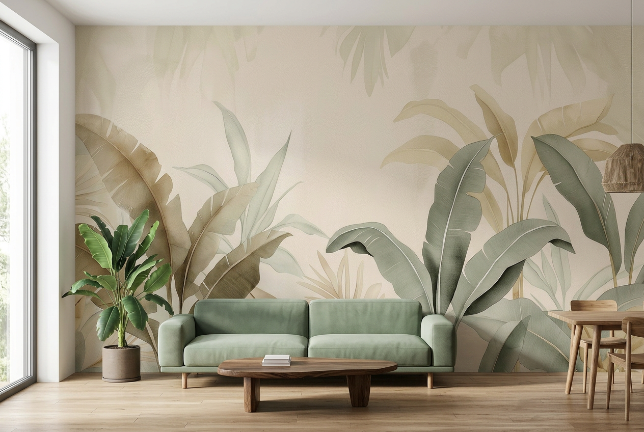 Ta wyjątkowa tapeta łączy w sobie majestatyczne palmy dżungli i soczyste liście bananowca tworząc kompozycję, która ożywi każde wnętrze. Neutralne kolory i beżowe tło nadają przestrzeni stonowany charakter, jednocześnie wprowadzając delikatny, tropikalny akcent. Idealna do nowoczesnych salonów, sypialni czy przestrzeni biurowych, nasza tapeta doskonale wpasowuje się w różnorodne aranżacje, dodając im odrobinę egzotycznego uroku.