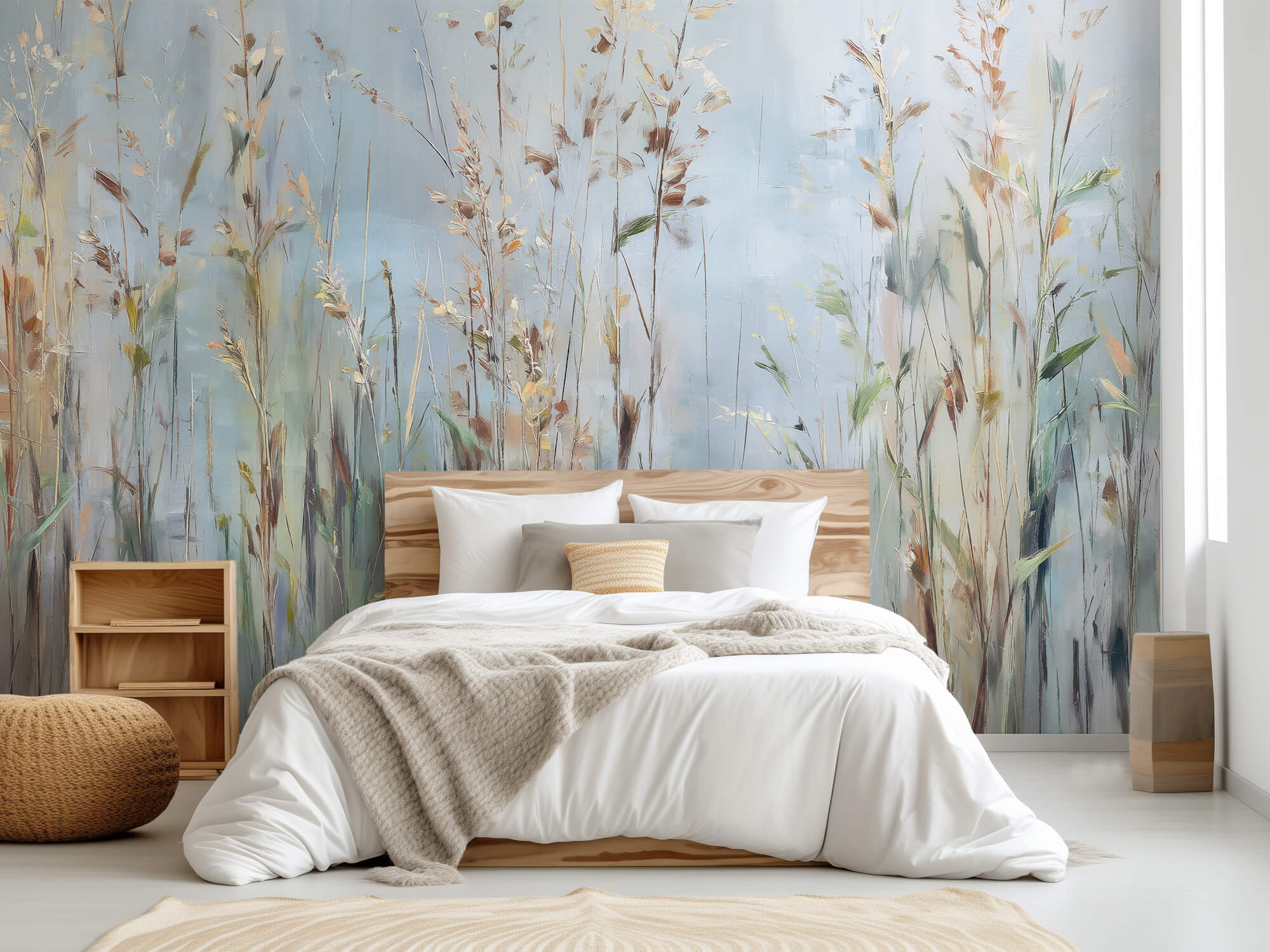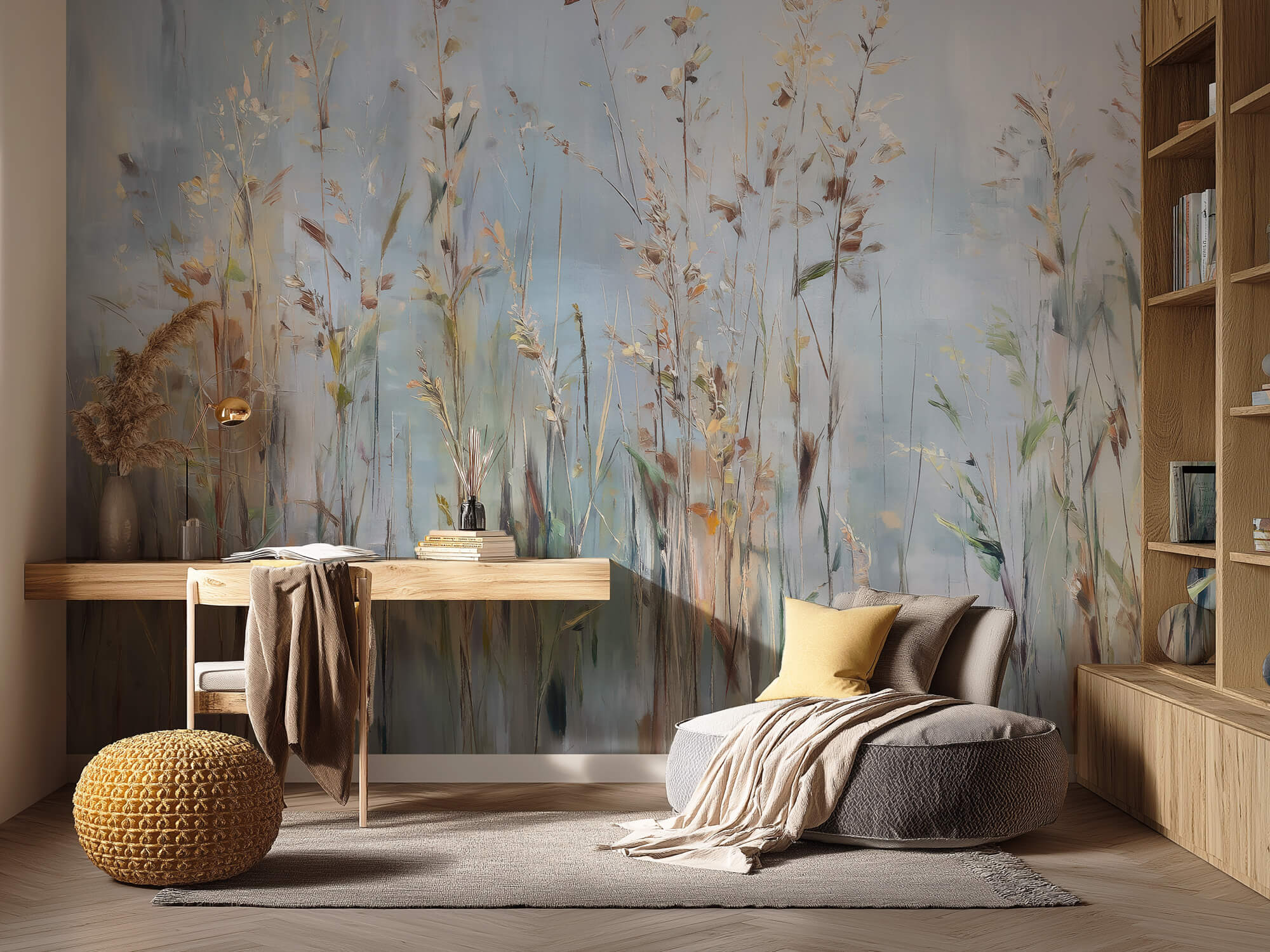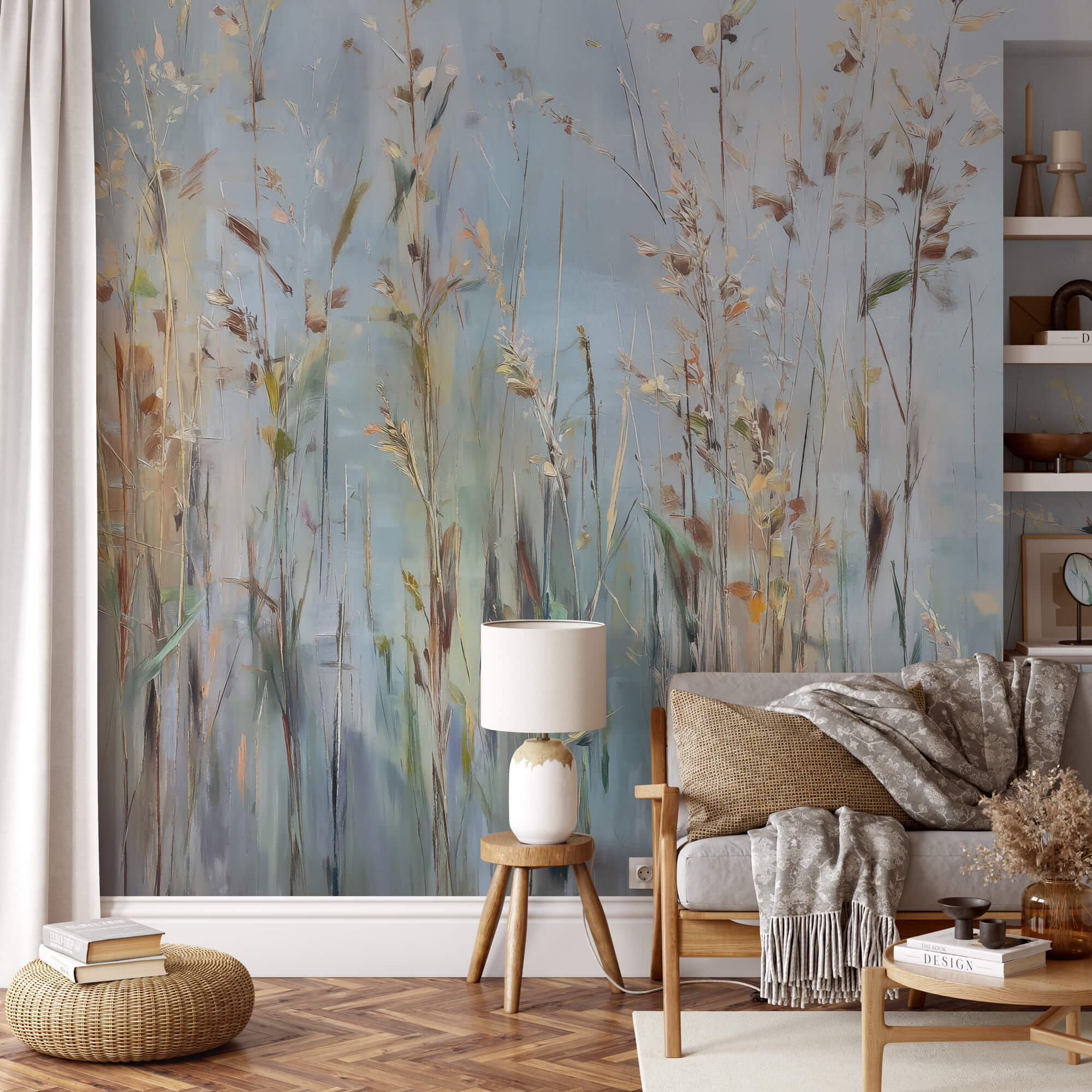 Whisperfield to mural ścienny, który oddaje ciszę pól o poranku. Subtelna, niemal zamglona kompozycja wysokich traw i źdźbeł malowana jest w chłodnych błękitach, szarościach i przygaszonej zieleni, z lekkimi muśnięciami beżu i ochry. Idealna do wnętrz, które mają tchnąć spokojem i naturalną harmonią. Pasuje do sypialni, salonu, gabinetu lub przestrzeni medytacyjnej – wszędzie tam, gdzie natura ma ukoić zmysły.